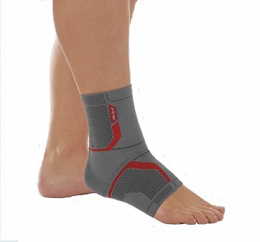Голеностопный бандаж из трикотажного полотна плоской вязки с внутренними силиконовыми пелотами, охватывающими лодыжки сзади.