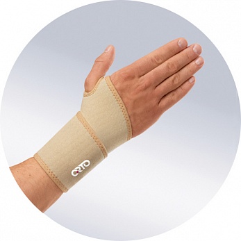Бандаж на лучезапястный сустав ORTO AWU-204 из материалов аэропрен и Coolmax, имеет отверстие для фиксации большого пальца и индивидуальную регулировку обхвата запястья.